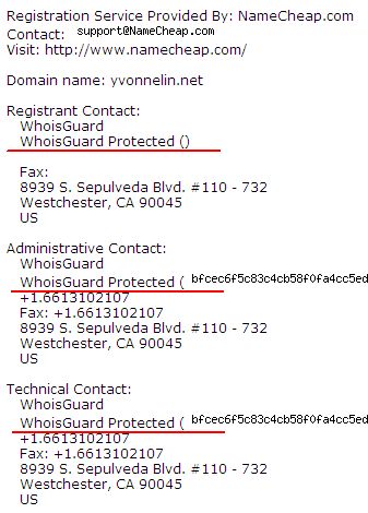 但对于不从事域名买卖的纯良民众,只想躲在电脑后面写些东西然后发到网上显摆显摆(比如某Y),又不想被人抓到来扔臭蛋,WhoisGuard就很好用了!大家可以看看我受保护情况下的Whois信息:打开http://whois.webhosting.info/yvonnelin.net