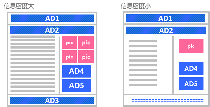 (3)以列表页作为研究对象,使用留白量和广告数来衡量信息密度。左侧页面用户体验差但信息含量大,留白少有5个广告;右侧页面信息含量少用户体验较好,留白多有4个广告。