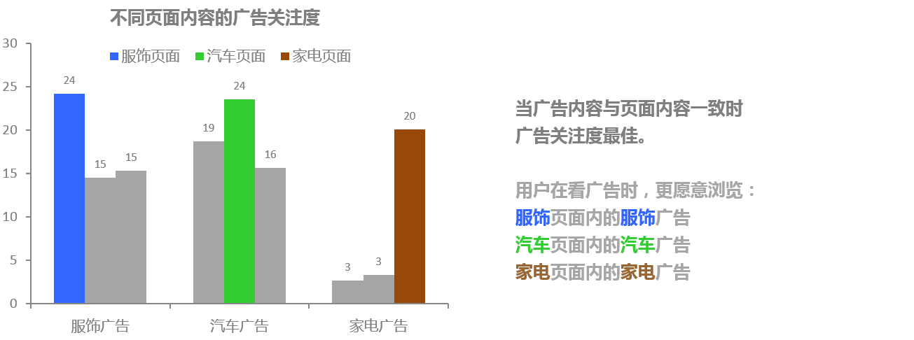 我们选择了三种不同内容的页面,包括:服饰页面、汽车页面、家电页面,也选择了三种广告,包括:服饰广告、汽车广告、家电广告,将这三种广告同时投放在三种不同页面上,使每种内容广告在不同页面上出现的位置和次数均等,实验发现:当广告内容与页面内容一致时,广告关注度最佳。 也就是说,用户浏览服饰页面时,会更关注服饰广告,浏览汽车页面时,更关注汽车广告,浏览家电页面时更关注家电广告。