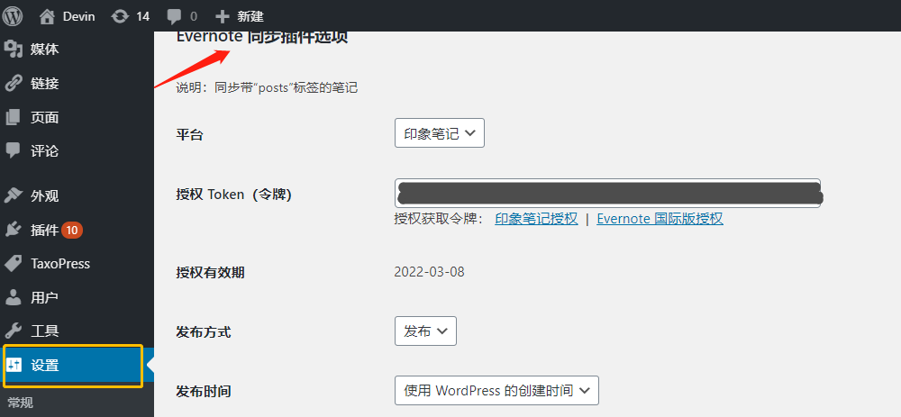 在WordPress 进入“设置(Settings) > Evernote 同步(Evernote Sync)”选择对应的平台和开发者token并保存;(点击下边“授权获取令牌”两个链接之一,然后在弹出的页面登录印象笔记账号,按步骤操作就能获得授权token)
