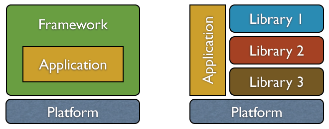框架与库之间最本质区别在于控制权:you call libs, frameworks call you(控制反转)