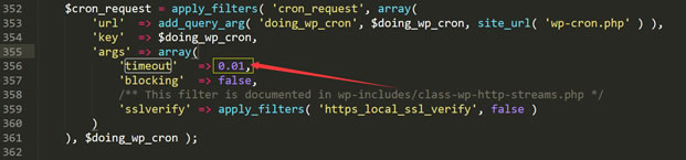 打开wp-includes目录下面的cron.php文件, 找到"timeout"代码。