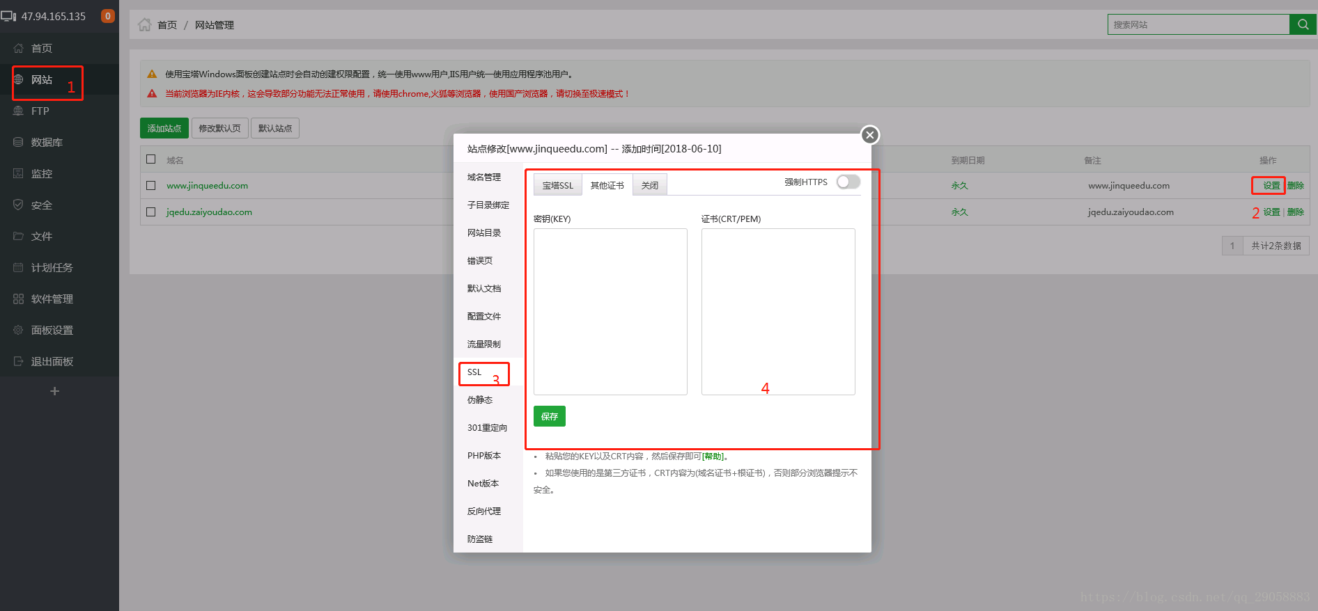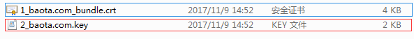 其中红框.key后缀的是服务器私钥,填入面板证书的左边红框中(用文本编辑器完整复制粘贴进去)