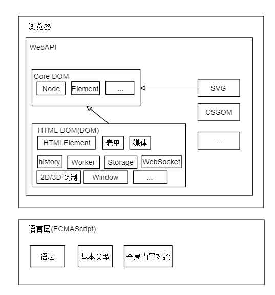 相对而言, 语言层则由ECMAScript规范定义的,比较独立, 近些年成果也比较显著.