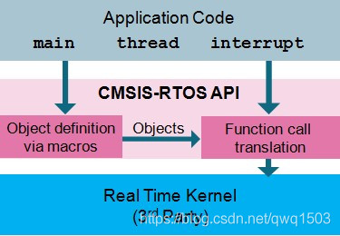 看了这张图的含义更清楚些,CMSIS-RTOS在用户的应用代码和第三方的RTOS Kernel直接架起一道桥梁,一个设计在不同的RTOS之间移植,或者在不同Cortex MCU直接移植的时候,如果两个RTOS都实现了CMSIS-RTOS,那么用户的应用程序代码完全可以不做修改。