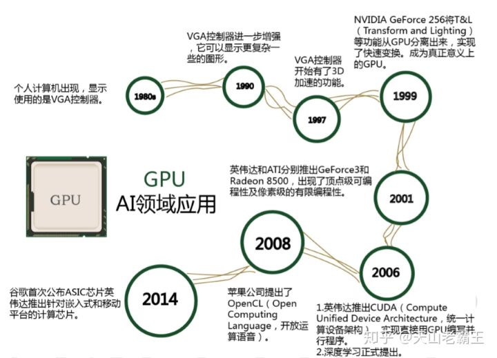 传统的CPU之所以不适合人工智能算法的执行,主要原因在于其计算指令遵循串行执行的方式,没能发挥出芯片的全部潜力。与之不同的是,GPU 具有高并行结构,在处理图形数据和复杂算法方面拥有比 CPU 更高的效率。对比 GPU 和 CPU 在结构上的差异,CPU 大部分面积为控制器和寄存器,而 GPU拥有更多的 ALU(ARITHMETIC LOGIC UNIT,逻辑运算单元)用于数据处理,这样的结构适合对密集型数据进行并行处理。程序在GPU系统上的运行速度相较于单核 CPU往往提升几十倍乃至上千倍。随着英伟达、AMD 等公司不断推进其对 GPU 大规模并行架构的支持,面向通用计算的 GPU(即 GPGPU,GENERAL PURPOSE GPU,通用计算图形处理器)已成为加速可并行应用程序的重要手段。