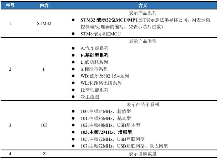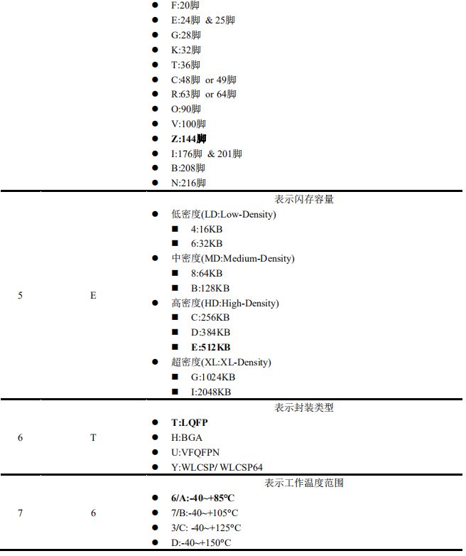 以STM32F103ZET6为例,解析STM32芯片命名规范如表 2.2.2 所示。