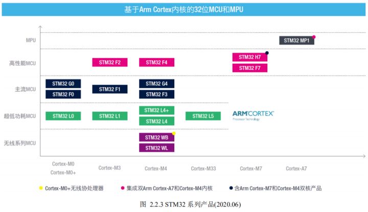 STM32如今产品系列非常丰富,主要为ARM Cortex-M内核系列MCU,也开始涉及ARM Cortex-A内核 系列MPU,如图 2.2.3 所示。按应用特性分类,可分为无线WB/WL系列、超低功耗L0/L1/L3/L5系列、主流 G0/G4/F0/F1/F3系列、高性能F2/F4/F7/H7系列、全新的MP1系列。