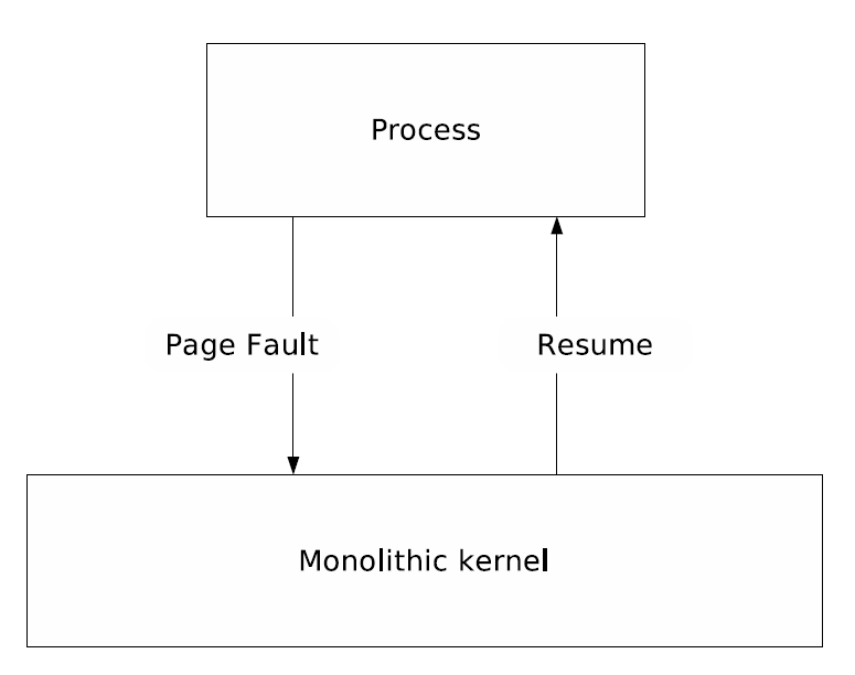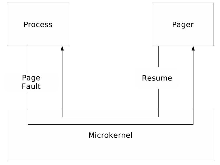 对于微内核的内存管理实现,有一个发展过程。在第一代的微内核架构中,内核代理了用户空间的内存管理,控制着内存访问的权限,如下图所示。