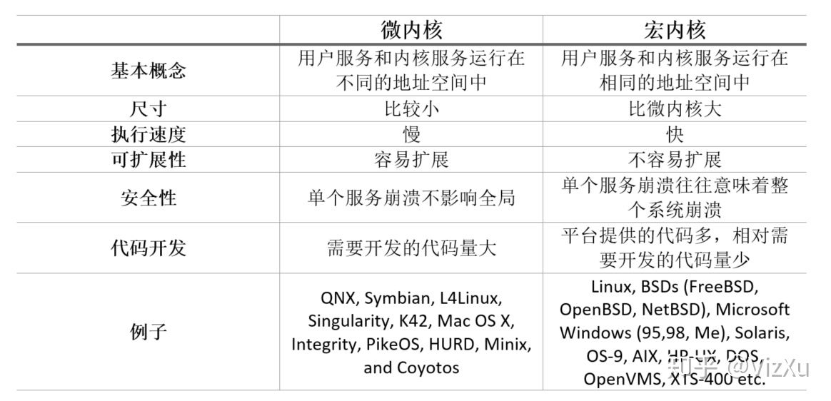 我们来列张表来对比一下微内核和宏内核的具体区别: