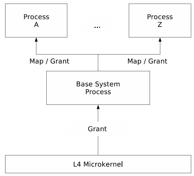 为了弥补性能上的损失,之后的微内核构架在内存管理上作了相应的改变。每个进程有3个内存管理原语(Primitves):map、grant和flush。如果进程想要共享它的内存页那么它的可以通过map来映射内存页给其它进程。当进程通过grant来让渡它的内存页给其它进程之后,该进程就丧失了这些内存页的访问权,直到让渡进程不再刷新它们。如此一来,整个系统运行过程就成了这样:在系统启动时,内核将所有内存保存到一个叫做基本的系统进程 (basic system process) 当中,当然这个所谓有基本进程是运行在用户空间中的,如果其它进程需要内存,就是再需要从内核中获取,它可以直接向这个基本的系统进程索取。如下图所示。