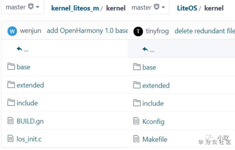 从gitee上的库kernel文件夹下的文件的日期都是两个月前,说明内核的发布时间比较一致,那文件的内容,分别对比文件目录,发现有很大的相似性,共有文件目录都是/base;/extended;/include;HUAWEI LiteOS下会有一个Kconfig和Makefile用于文件包含定义和Kconfig文件菜单生成;而HarmonyOS则是BULD.gn和los_init.c分别用于IDE的文件编译及内核文件剪辑初始化文件,文件功能基本移植,只是适配的编译环境不同。