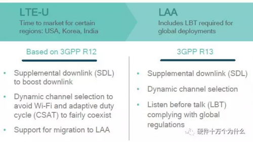 LTE-U 方案在 2013 年正式提出,到了 2014 年,Verizon 联合阿尔卡特朗讯、爱立信、高通、三星成立了 LTE-U 论坛,基于 3GPP 的 R12 协议联合开发相关技术文档。也就是说,LTE-U 技术并不是由 3GPP 组织开发和演进,这点不同于 LAA,也是 LTE-U 的一大劣势。
