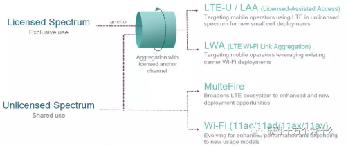 标准的 LTE 技术只能部署在授权频谱,不能直接部署在非授权频谱。随着 LTE 技术和应用的逐步成熟,授权频谱中的数据流量越来越饱和,有必要考虑将流量从授权频谱分流一部分到非授权频谱。经过运营商、设备商和芯片厂商等的共同努力,目前可以将 LTE 流量分流到非授权频谱的主流技术是:LTE-U、LAA(Licensed Assisted Access)、LWA 和 MulteFire。