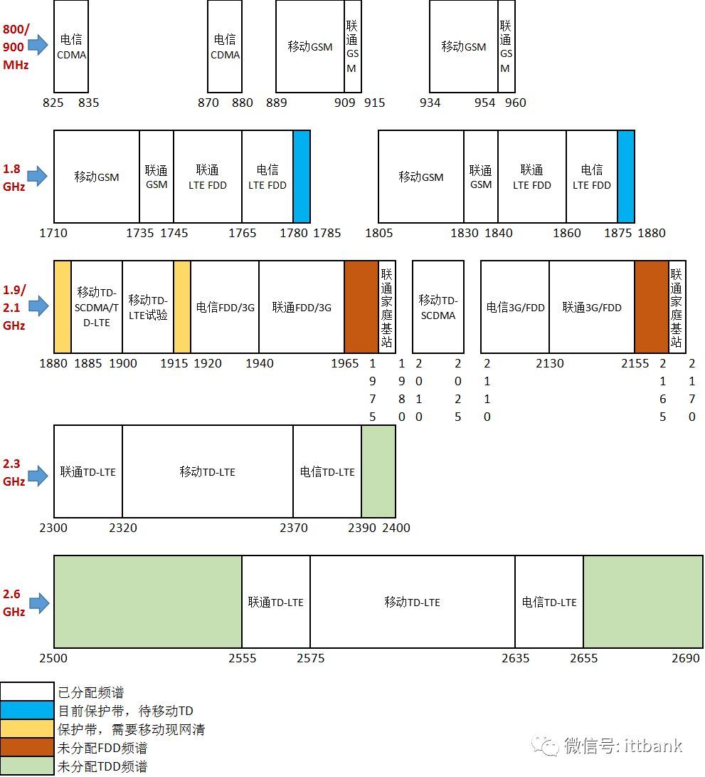 1)黄色保护带:原移动用1880-1900(20M),电信用1860-1875(15M),由于TD和FDD之间有干扰,需留1875-1880间的5M出来做隔离带。电信把小灵通占用频段(1900-1920)清出来还给移动后,移动就拥有完整的从1880-1920的40M频段,但隔离带由移动侧出1880-1885间的5M。这样,电信就可以用1860-1880做完整的20M载波。移动用1885-1920的35M。