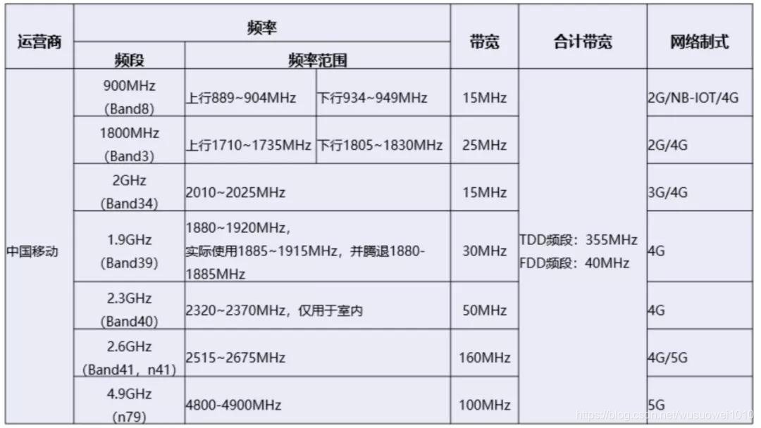 900MHz(Band8),889904/934949MHz:最初获批用于部署GSM,为2G频段,现用于GSM、NB-IoT、LTE FDD。GSM和NB-IOT使用894-909/939-949MHz(10MHz),LTE FDD 使用889-894/934-939MHz (5MHz),原904-909MHz/949-954MHz 让给中国联通。Band8是移动4G打底频段。
