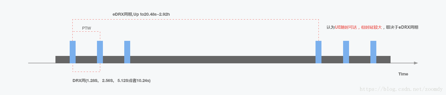 eDRX模式可以认为终端设备随时可达,但时延较大,时延取决于eDRX周期配置,可以在低功耗与时延之间取得平衡。