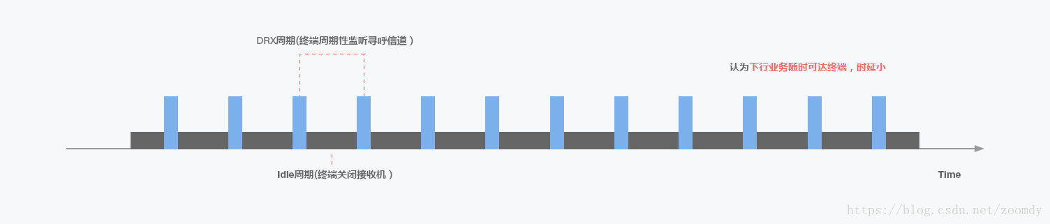 由于DRX周期短( 1.28s,2.56s,5.12s 或者10.24s,由运营商网络侧设置决定),可认为下行业务随时可达,时延小。