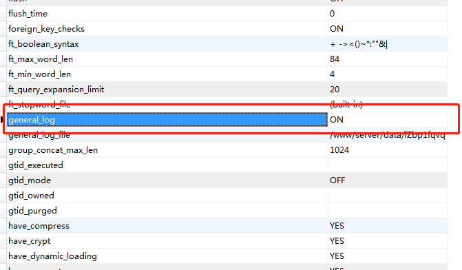 注意:网上找的资料显示,开启“log”参数,但是我的机器里面实际没有“log”参数,找到了“general_log”参数。