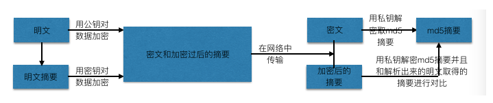 发送方用公钥给数据进行加密,然后把加密后的数据发送到接收方,然后接收方用对应的私钥解密,因为只有接收方的私钥才能解析数据,所以即使被第三方窃取到数据也没有关系。这个模式叫做加密模式。在这个过程中如何保证数据的完整性,保证数据是发送方发送的数据,而不是被第三方篡改后的数据。这时就要用到签名,在发送方加密明文之前,给明文取md5值,得到其信息的摘要(注:不能通过信息摘要反推明文)。然后用公钥分别给明文和明文的摘要加密发送到数据的接收方,数据的接收方接收到数据之后,用私钥对密文和摘要进行解密,然后对解密得到的明文取md5摘要,比对解密后的明文摘要和发送过来的摘要是否一致;一致就证明数据是原始的数据没有遭到篡改。这个加密的过程中保证了数据的安全性(即只有接收方才可以解密)和防篡改性(签名认证),这就保证了上面说的数据传输要求中的第一点和第三点。下面是图解过程: