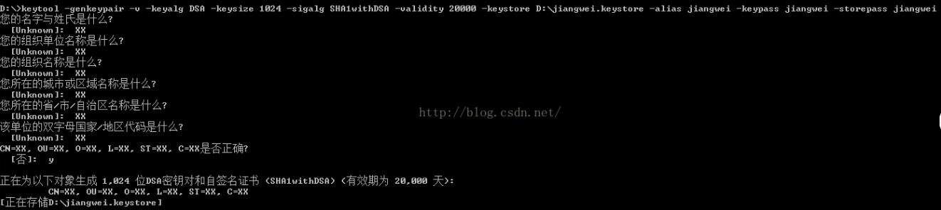 keytool -genkeypair -v -keyalg DSA -keysize 1024 -sigalg SHA1withDSA -validity 20000 -keystore D:\jiangwei.keystore -alias jiangwei -keypass jiangwei -storepass jiangwei