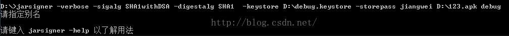jarsigner -verbose -sigalg SHA1withDSA -digestalg SHA1 -keystore D:\jiangwei.keystore -storepass jiangwei D:\123.apk jiangwei