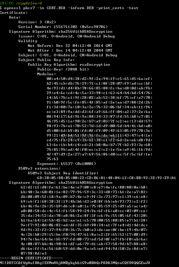 openssl pkcs7 -inform DER -in CERT.RSA -noout -print_certs –text