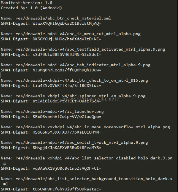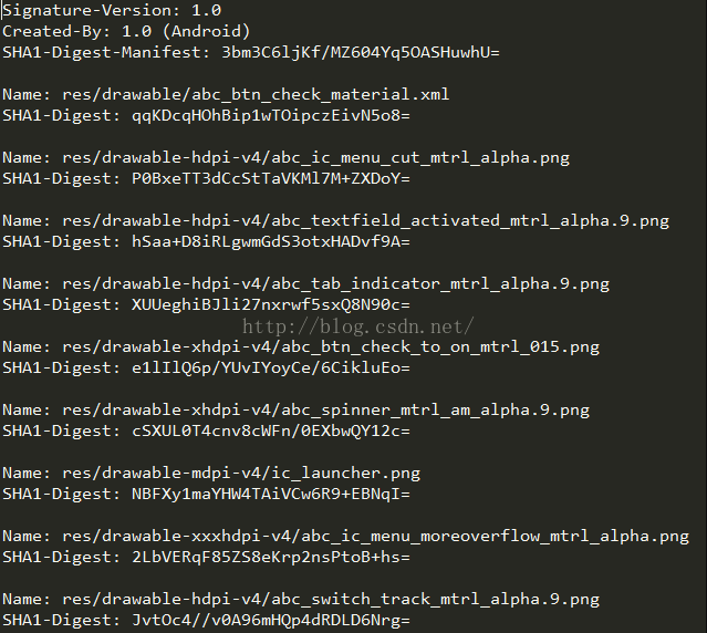 逐一遍历里面的所有条目,如果是目录就跳过,如果是一个文件,就用SHA1(或者SHA256)消息摘要算法提取出该文件的摘要然后进行BASE64编码后,作为“SHA1-Digest”属性的值写入到MANIFEST.MF文件中的一个块中。该块有一个“Name”属性,其值就是该文件在apk包中的路径。