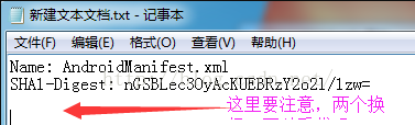 用AndroidManifest.xml为例,我们把MANIFEST.MF文件中的条目拷贝保存到txt文档中: