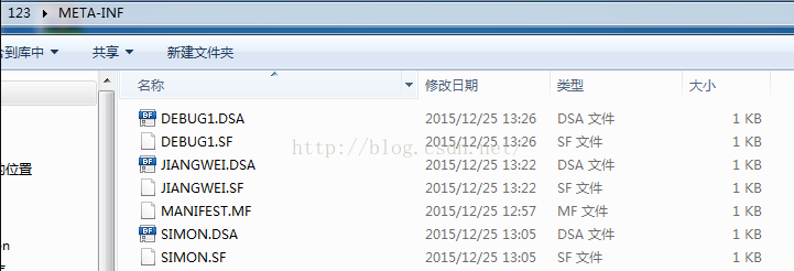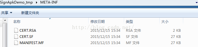 通过上面的签名时我们可以看到,Android签名apk之后,会有一个META-INF文件夹,这里有三个文件: