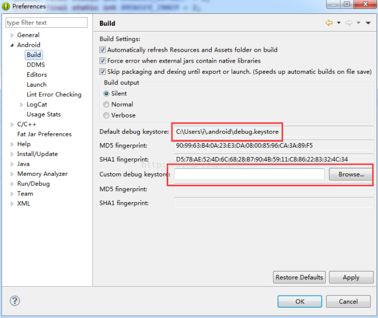 3》Eclipse中我们在跑Debug程序的时候,默认用的是jarsigner方式签名的,用的也是系统默认的debug.keystore签名文件