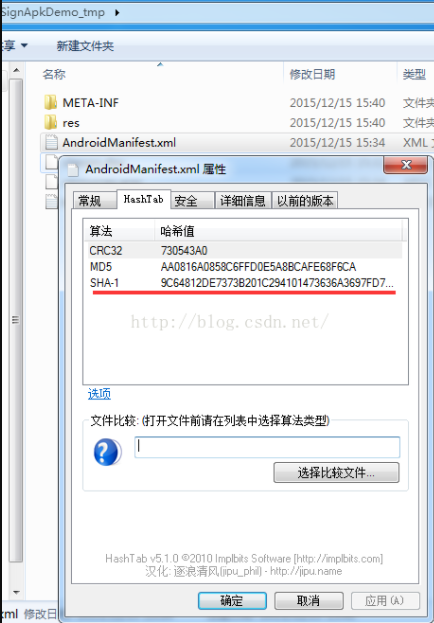 然后我们安装HashTab之后,找到AndroidManifest.xml文件,右击,选择Hashtab:
