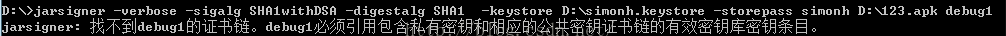 这个问题的原因是因为我们在使用keytool生成keystore的时候,起了debug的别名,这个问题困扰了我很久,最后做了很多例子才发现的,就是只要我们的keystore文件的别名是debug的话,就会报这样的错误。这个应该和系统默认的签名debug.keystore中的别名是debug有关系吧?没有找到jarsigner的源码,所以只能猜测了,但是这三个问题在这里标注一下,以防以后在遇到。