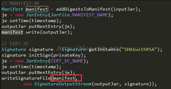 //CERT.SFSignature signature = Signature.getInstance("SHA1withRSA");signature.initSign(privateKey);je = new JarEntry(CERT_SF_NAME);je.setTime(timestamp);outputJar.putNextEntry(je);writeSignatureFile(manifest,new SignatureOutputStream(outputJar, signature));