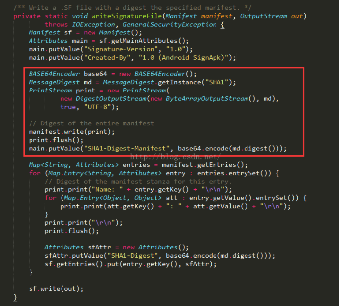 /** Write a .SF file with a digest the specified manifest. */private static void writeSignatureFile(Manifest manifest, OutputStream out) throws IOException, GeneralSecurityException { Manifest sf = new Manifest(); Attributes main = sf.getMainAttributes(); main.putValue("Signature-Version", "1.0"); main.putValue("Created-By", "1.0 (Android SignApk)"); BASE64Encoder base64 = new BASE64Encoder(); MessageDigest md = MessageDigest.getInstance("SHA1"); PrintStream print = new PrintStream( new DigestOutputStream(new ByteArrayOutputStream(), md), true, "UTF-8"); // Digest of the entire manifest manifest.write(print); print.flush(); main.putValue("SHA1-Digest-Manifest", base64.encode(md.digest())); Map<String, Attributes> entries = manifest.getEntries(); for (Map.Entry<String, Attributes> entry : entries.entrySet()) { // Digest of the manifest stanza for this entry. print.print("Name: " + entry.getKey() + "\r\n"); for (Map.Entry<Object, Object> att : entry.getValue().entrySet()) { print.print(att.getKey() + ": " + att.getValue() + "\r\n"); } print.print("\r\n"); print.flush(); Attributes sfAttr = new Attributes(); sfAttr.putValue("SHA1-Digest", base64.encode(md.digest())); sf.getEntries().put(entry.getKey(), sfAttr); } sf.write(out);}