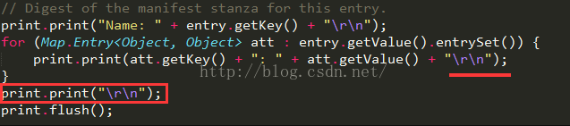 Map<String, Attributes> entries = manifest.getEntries();for (Map.Entry<String, Attributes> entry : entries.entrySet()) { // Digest of the manifest stanza for this entry. print.print("Name: " + entry.getKey() + "\r\n"); for (Map.Entry<Object, Object> att : entry.getValue().entrySet()) { print.print(att.getKey() + ": " + att.getValue() + "\r\n"); } print.print("\r\n"); print.flush(); Attributes sfAttr = new Attributes(); sfAttr.putValue("SHA1-Digest", base64.encode(md.digest())); sf.getEntries().put(entry.getKey(), sfAttr);} sf.write(out);