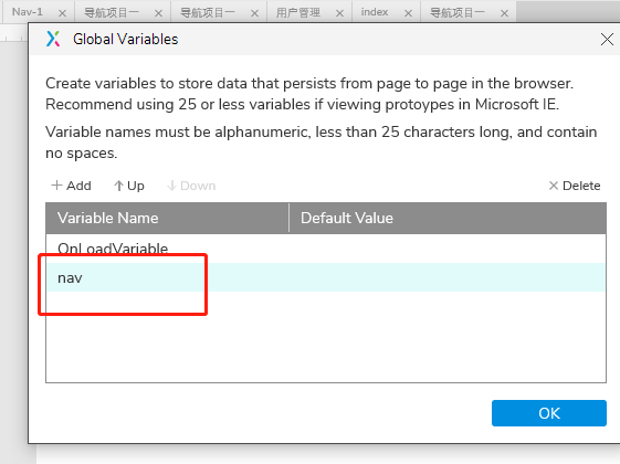 (1)设置一个全局变量nav,用于传递页面名称PageName,操作位置:项目-全局变量