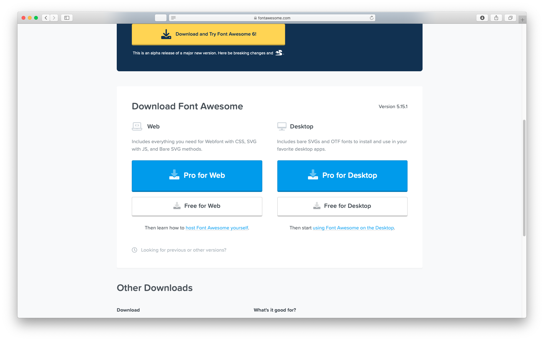 要想使用 Font Awesome,必然本地需要先可以识别,那么需要先安装字体文件。前往官方下载页面 https://fontawesome.com/download,选择下载 Free for Desktop 版本。
