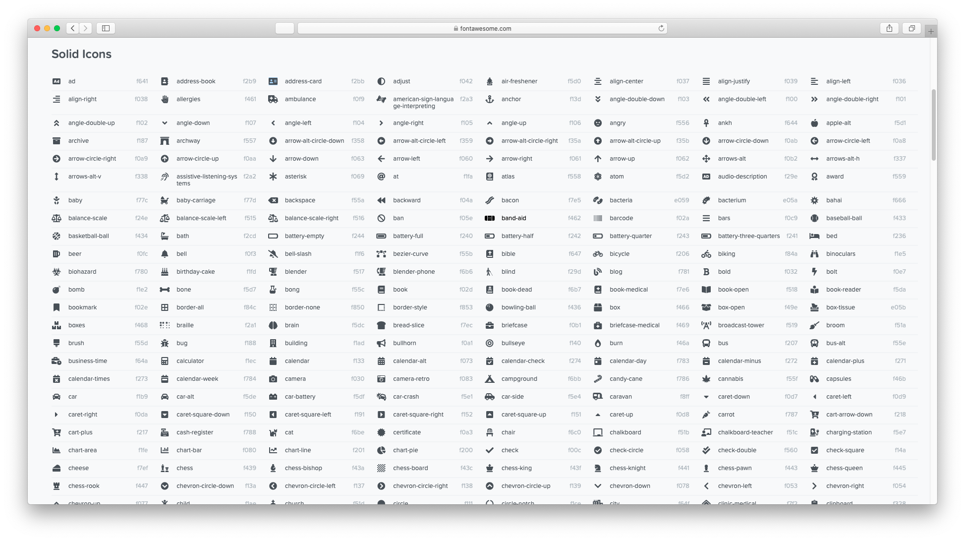 使用 https://fontawesome.com/cheatsheet,页面上的图标可以之间点击选中,复制即可。