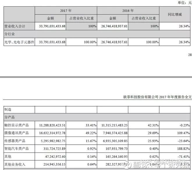 拿我比较熟悉的欧菲科技举例,(期乐会官方微信公众平台ID:qlhclub)查看其在17年报中“经营情况讨论与分析”部分的分业务收入拆分表,才可以清晰地发现:
