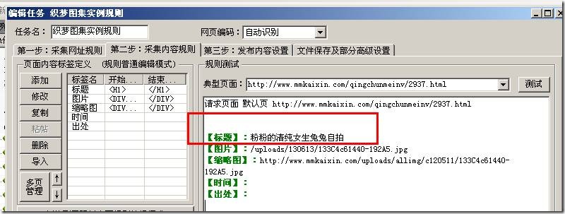 这个功能就是用正则表达式分开来表达我们需要的部分和不需要的部分,然后把需要的那那部分拿出来,不要的那部分就去掉。用下面的一个例子来简单说明下如何在采集器里面使用: