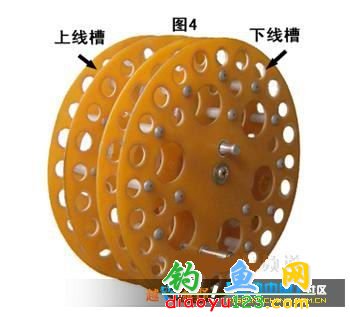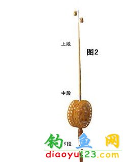 抬竿包括面竿(钓者面前的手握部份)和背竿两部份。面竿由竿体、盘子(卷线器)和出线环组成。整个抬竿的长度为1~1.5米左右,竿体象小海竿样,上细下粗,其顶端有一上一下一左一右两个直径约2~3厘米带轴承的出线环,一般左上右下或并排在一起;中下部手把以上装有盘子,为位于竿体左右两个通过轴承横穿竿体的两个直径在20cm左右的圆盘(卷线器)。在左右盘子内可分别卷入100~150米直径在0.5毫米左右的尼龙线(俗称大线),一般左边稍多于右边,并在左右盘子中分别从正反两个方向卷入。由于盘子与竿体靠轴承连接,因此通过右盘子上的摇柄摇动盘子时就相当灵活,并可利用右盘子上的离合装置使左右盘子能同时或单独转动,以利收放大线。抬竿下端为插脚,由不锈钢材料制成镖形,以便轻易插在地上的土里。背竿由竿体、背轮和背绳构成,竿体(包括前述抬竿的竿体)多选用多年生的竹梢(本地叫硬头黄竹,质硬、韧性好)长约1.5米,也可以做到4~5米长,但均可以拆成短节,便于携带;背轮位于竿体的顶端,为直径约10厘米、厚约1.0厘米,中心带轴承的轮子,起通过大线的作用;背绳为系在竿子上端背轮下方的比竿体稍长50厘米左右的细绳,使用时背竿插于对岸的坡地上,将带插子的两条背绳八字形分开插于背竿后面,起稳固背竿的作用。当然左右过线轮、背轮、盘子等物的制作需由渔具厂特制,钓者只需购买配件根据喜好、审美组装即成,也可购买成品,全套产品不超过二百元。其余用具如抄网、鱼护等同传统钓。