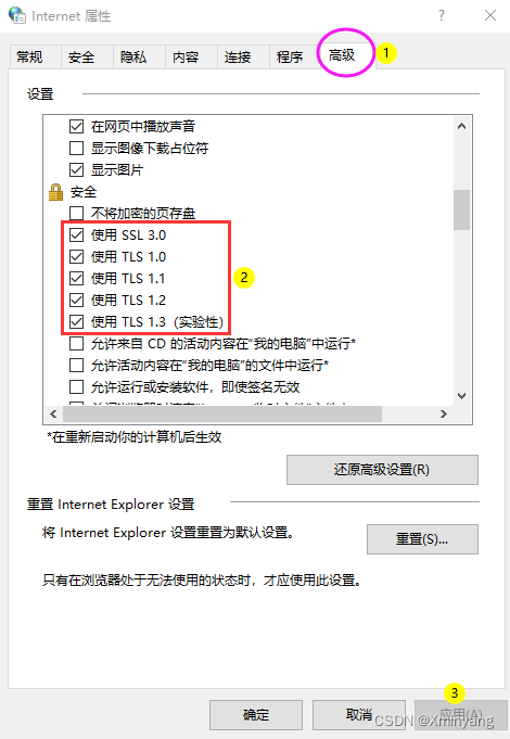 首先Win + R,输入inetcpl.cpl,进入Internet属性窗口;然后,选择高级,将安全内的SSL系列选项全部选中,再按下右下角的应用(A)即可。