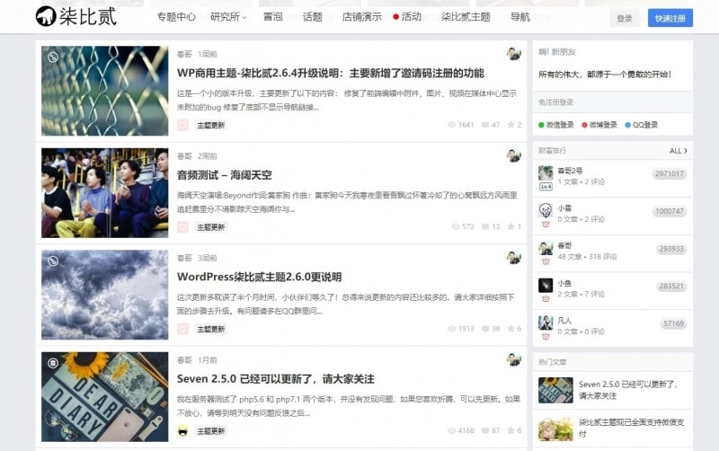 柒比贰主题,适合创业者,和其他把文章和内容的展示作为重点不同,柒比贰主题更多的是网站用户之间的互动,主题包含论坛、冒泡、活动、商城、小游戏等功能,使用柒比贰主题你可以把自己的网站打造成一个社区,用户之间互相交流,创作内容,让网站运营的更有活力