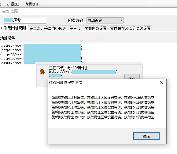 第0级获取网址时出错;获取网址区域设置有误,获取的代码内容为空。
