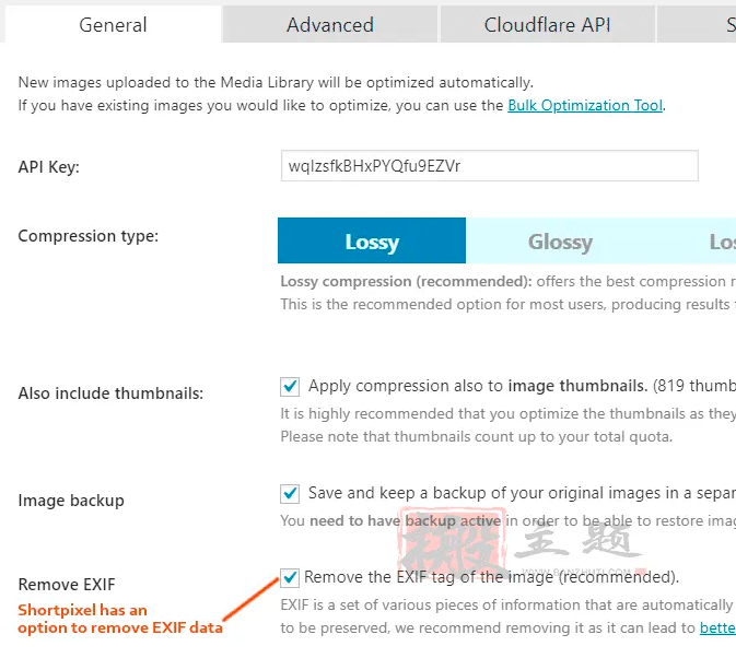 移除它可以使图像略微变小。你可能不需要光圈、快门速度、ISO、焦距、相机型号、照片拍摄日期以及图像中的其他无用数据。大多数图像优化插件都有一个删除EXIF数据的选项(下面是ShortPixel)。