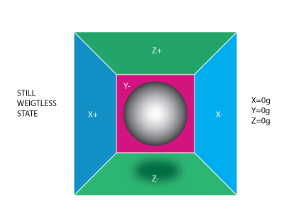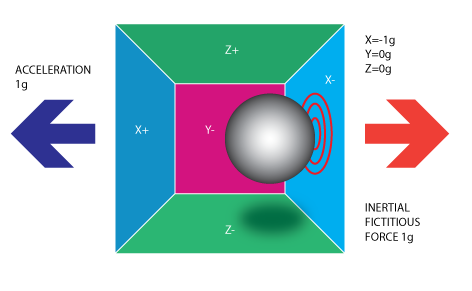 我们假定这个盒子不在重力场中或者其他任何会影响球的位置的场中,球处于盒子的正中央。你可以想象盒子在外太空中,远离任何天体,如果很难想象,那就当做盒子在航天飞机中,一切东西都处于无重力状态。在上面的图中你可以看到我们给每个轴分配了一对墙(我们移除了Y+以此来观察里面的情况)。设想每面墙都能感测压力。如果我们突然把盒子向左移动(加速度为1g=9.8m/s^2),那么球会撞上X-墙。然后我们检测球撞击墙面产生的压力,X轴输出值为-1g。