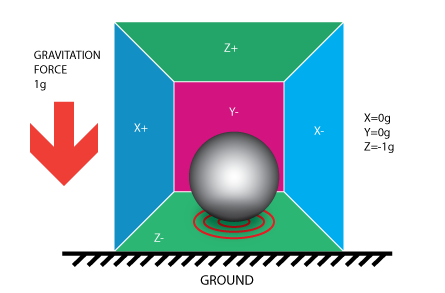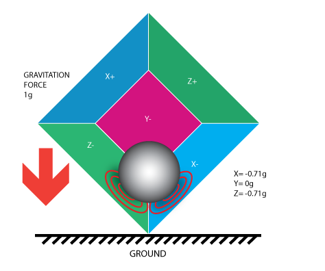 在这种情况下盒子没有移动但我们任然读取到Z轴有-1g的值。球在墙壁上施加的压力是由引力造成的。在理论上,它可以是不同类型的力量 – 例如,你可以想象我们的球是铁质的,将一个磁铁放在盒子旁边那球就会撞上另一面墙。引用这个例子只是为了说明加速度计的本质是检测力而非加速度。只是加速度所引起的惯性力正好能被加速度计的检测装置所捕获。