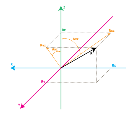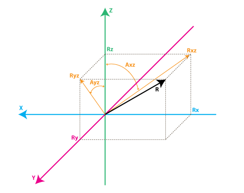 AXZ – Rxz(矢量R在XZ平面的投影)和Z轴所成的夹角