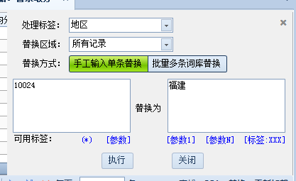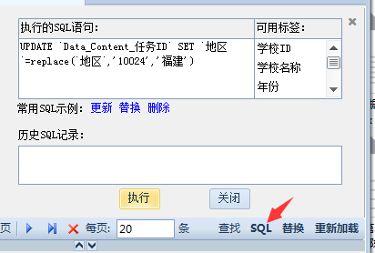 在刚才点替换的旁边 有个SQl,点击出现上图,通过SQL语句进行替换,不需要自己写,只要直接点击上图中的 蓝色替换字 就会自动生成SQl语句,然后我们进行修改即可,上图中地区是内容所在标签名,10024是要被替换的内容,福建是替换后的内容,设置好后,点执行即可。